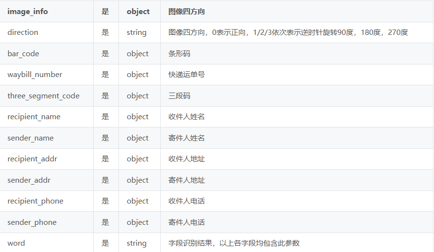 快速精准识别快递面单图片上的信息,返回快递单上的结构化文字信息,包括运单号、收/寄件人姓名、收/寄件人电话、收/寄件人地址等。