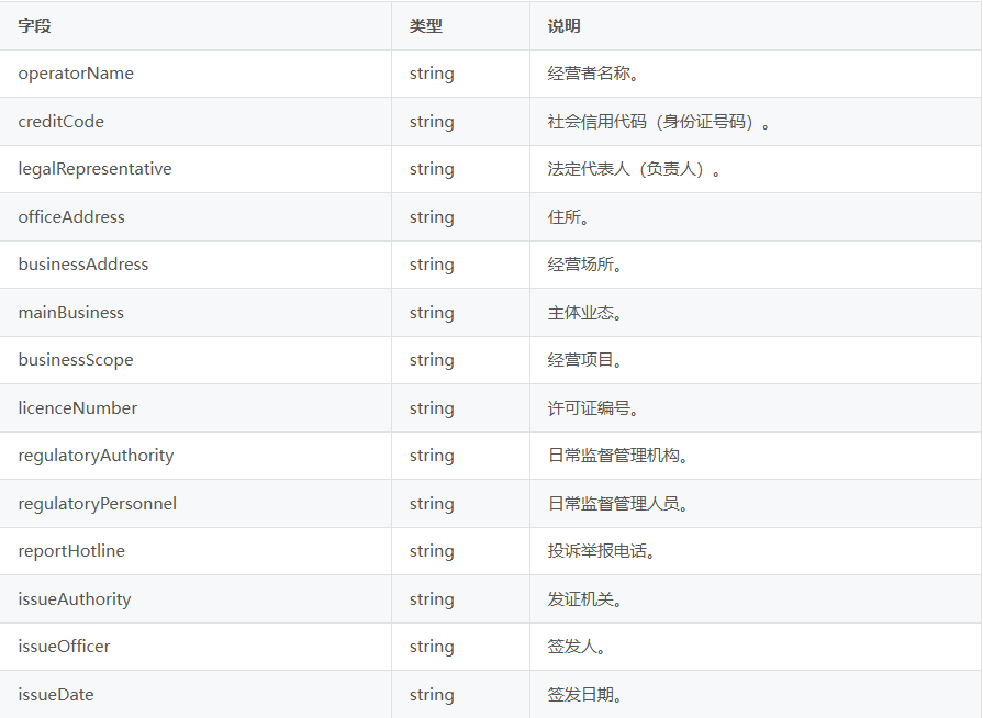 食品经营许可证识别接口,快速精准的识别食品经营许可证所包含生产者名称、社会信用代码、法定代表人姓名、地址、生产场所、食品类别、有效期、许可证编号等数十个关键字段信息。