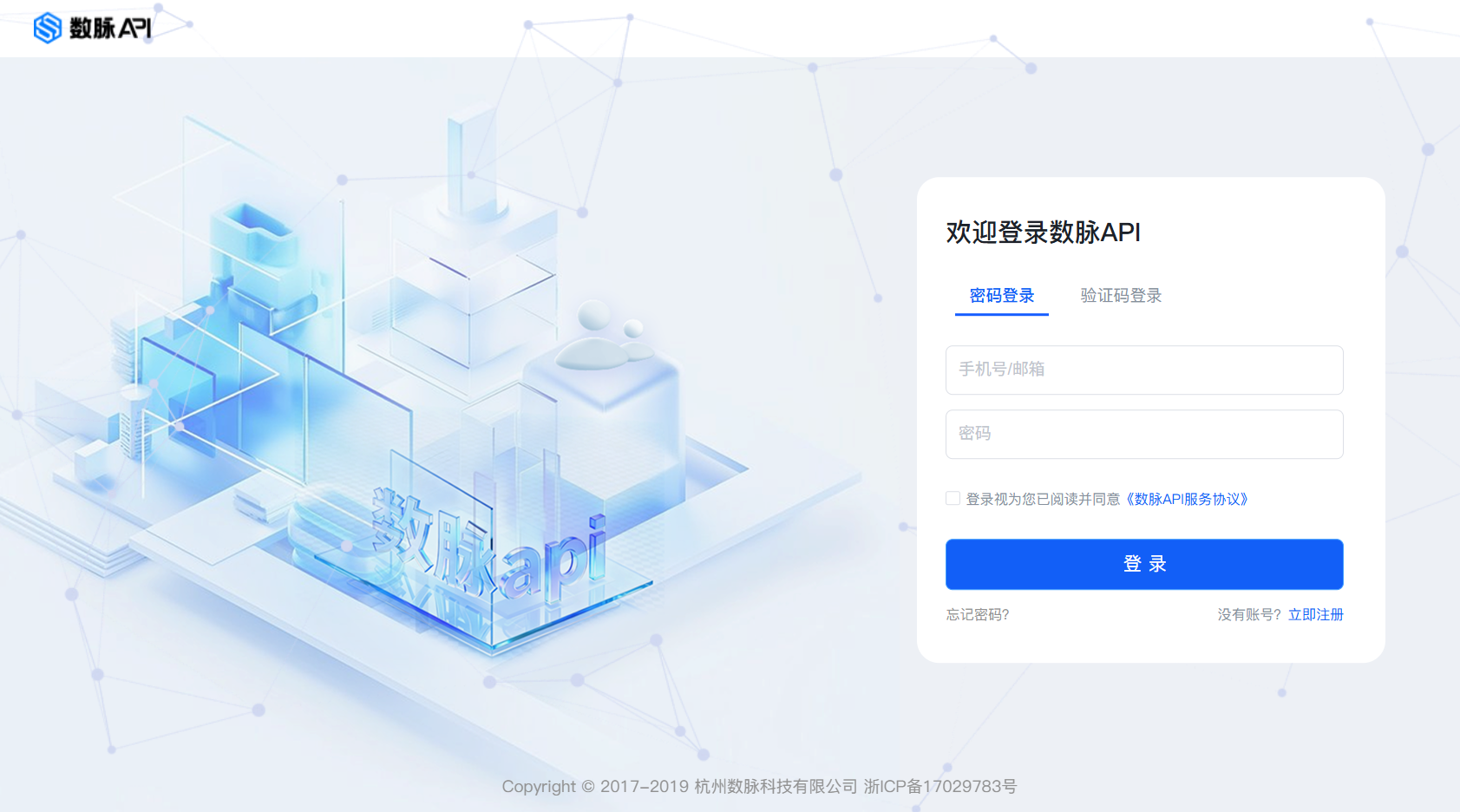 数脉API平台首页顶部导航右上角“登录”“注册”按钮