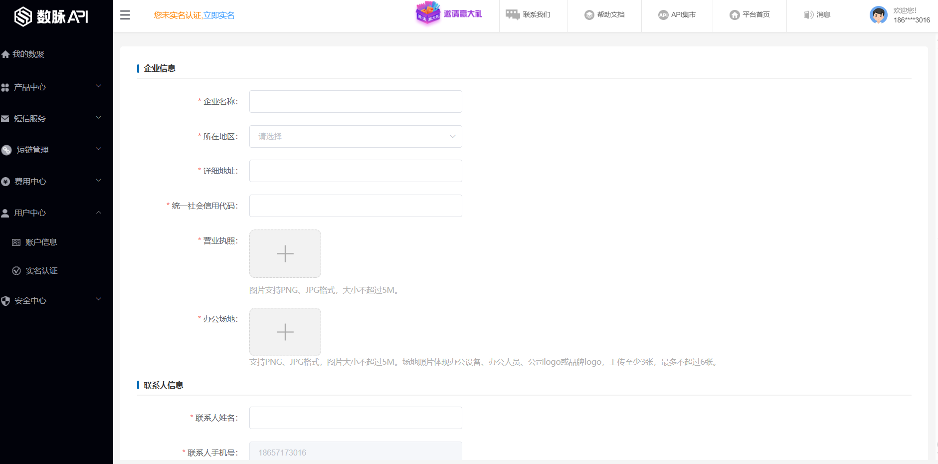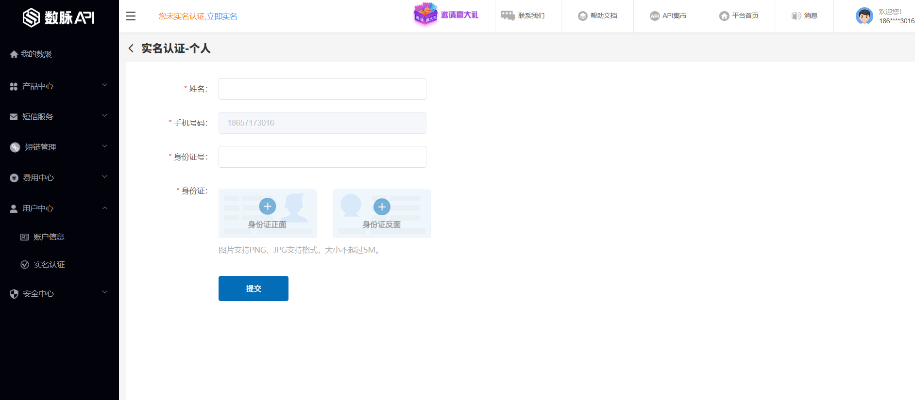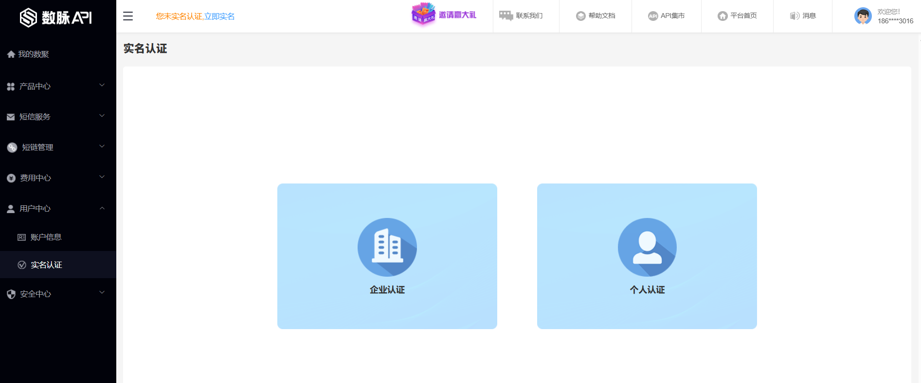 登录数脉API平台,点击“控制台”按钮进入商户后台。点击“立即认证”按钮,进入“实名认证”页面